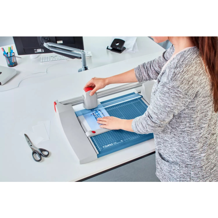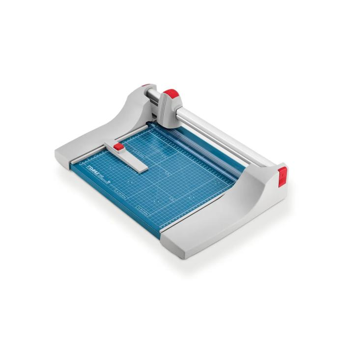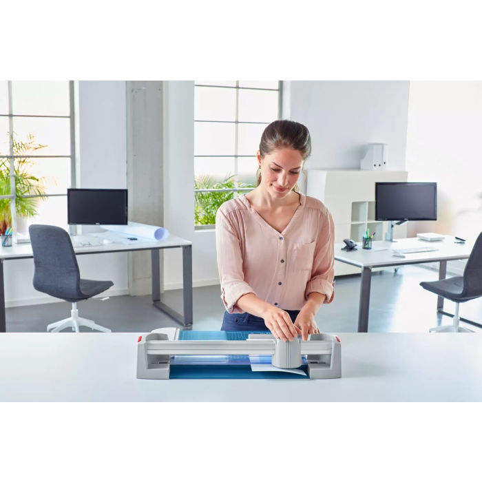 Profesionálna rezačka s kovovou základňou a presným rezom na grafické účely (filmy, fólie, papier). Kvalita na dosiahnutie najvyššej presnosti - automatický prítlak pohybom rezacej hlavy, nastaviteľný zadný doraz s použitím na oba boky, množstvo zakreslených orientačných DIN formátov. Kruhový nôž umiestnený v plastovom ochrannom kryte sa automaticky brúsi pri rezaní o protinôž (oba nože z tvrdenej ocele). Mierka v cm/inch. Možnosť montáže na stenu.