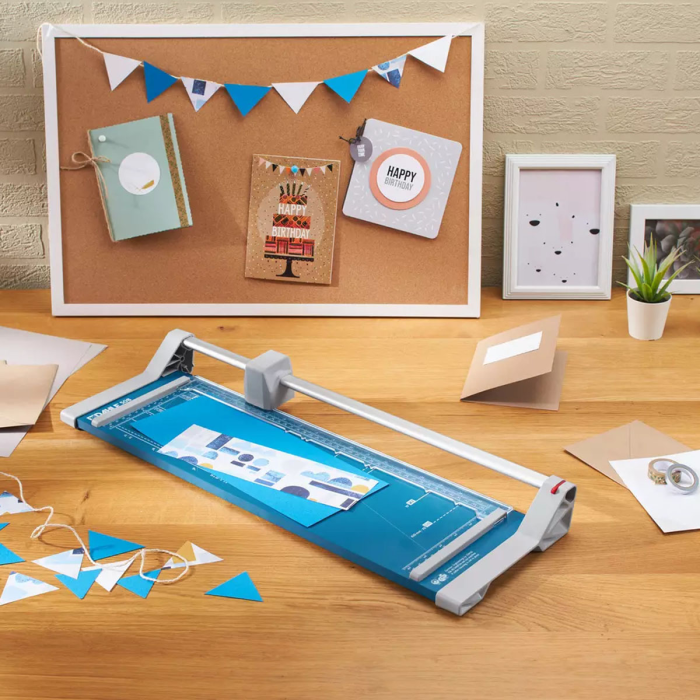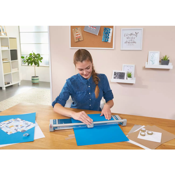 Rezačka s kruhovým nožom a kovovou základňou. Rotačný nôž v plastovom kryte, automatický prítlak, mierky v cm a DIN formátoch. Vhodná na rezanie papiera, etikiet, fotiek a filmov.