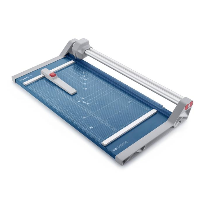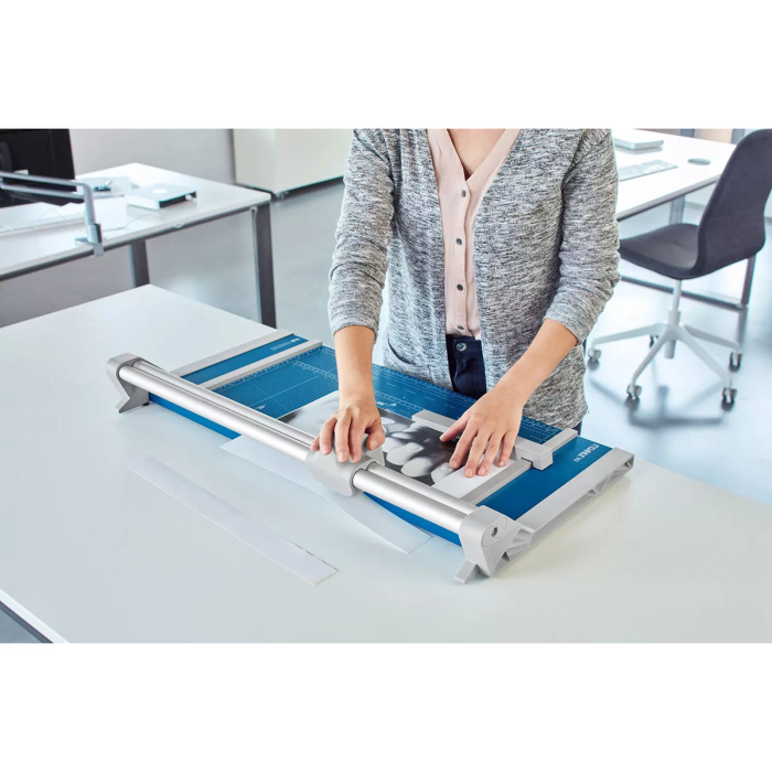 Profesionálna rezačka s kovovou základňou a presným rezom na grafické účely (filmy, fólie, papier). Kruhový nôž umiestnený v plastovom ochrannom kryte sa automaticky brúsi pri rezaní o protinôž - oba nože z tvrdenej ocele. Automatický prítlak pohybom rezacej hlavy, zadný doraz. Mierka v cm/inch. Na pracovnom stole sú vyznačené formáty DIN. Možnosť montáže na stenu.