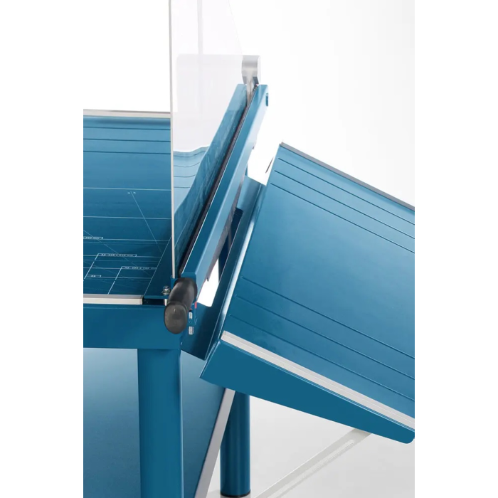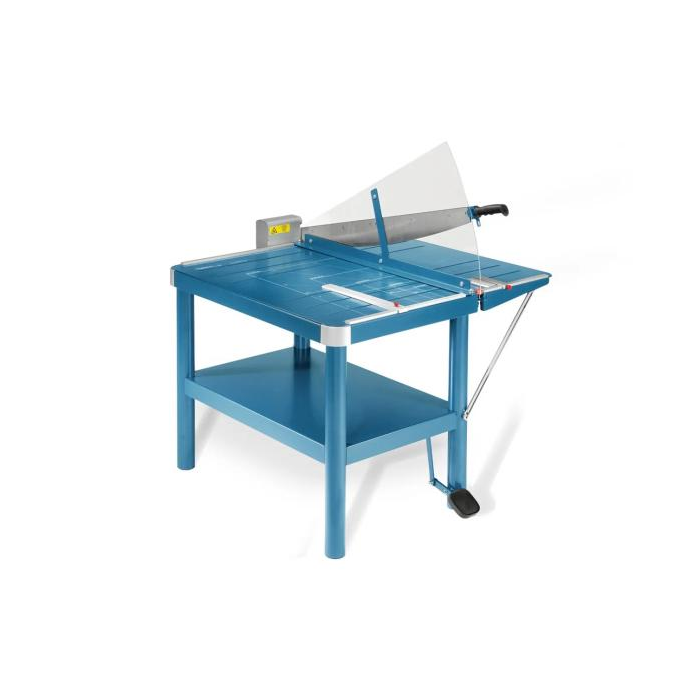 Veľká kovová robustná páková rezačka s vlastným stojanom a uzamykateľným nožom. Brúsený vrchný a spodný nôž z kvalitnej nožiarskej ocele Solingen, rozkladateľný bočný stôl, nožný pedál na zabezpečenie prítlaku rezaného papiera, priehľadný ochranný kryt ostria z plexiskla, 2 bočné dorazy, zadný doraz. Predný doraz, fixovateľný ručnou pákou, vysúvateľný do 275 mm. Mierka v cm/ inch, DIN formáty.K rezačke je možné objednať zariadenie na rezanie tenkých prúžkov a zariadenie umožňujúce vytvoriť laserový lúč, indikujúci reznú líniu.