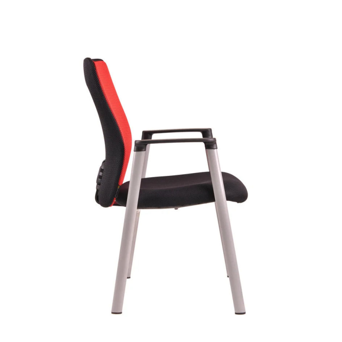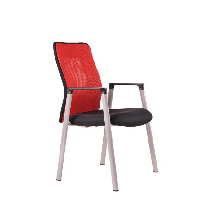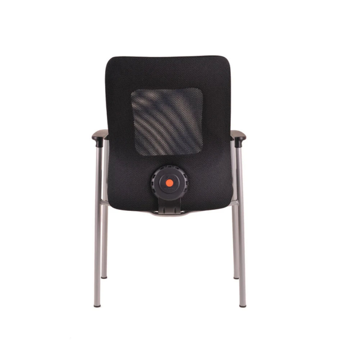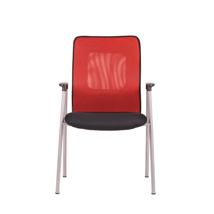 Rokovacia čalúnená stolička s pevnou robustnou konštrukciou. Sivá kostra, operadlo čalúnené samonosnou sieťovinou, nosnosť 120 kg