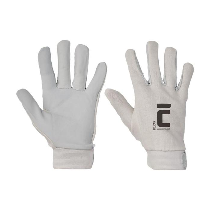 Rukavice šité z jemnej lícovej ovčiny v dlani, bielej bavlnenej tkaniny na chrbte a manžetou na suchý zips.