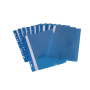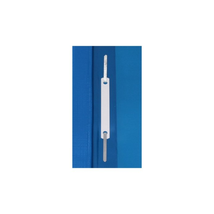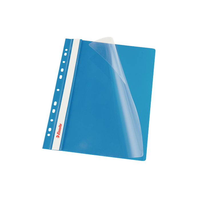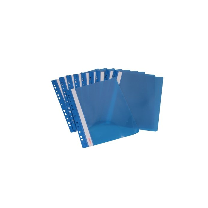 Obal s eurodierovaním z kvalitného PVC na uloženie dierovaných dokumentov do formátu A4. Predná strana priehľadná, pozdĺž chrbta biely obojstranný papierový zasúvací štítok. Rozmery 310 × 235 mm. Farba modrá.