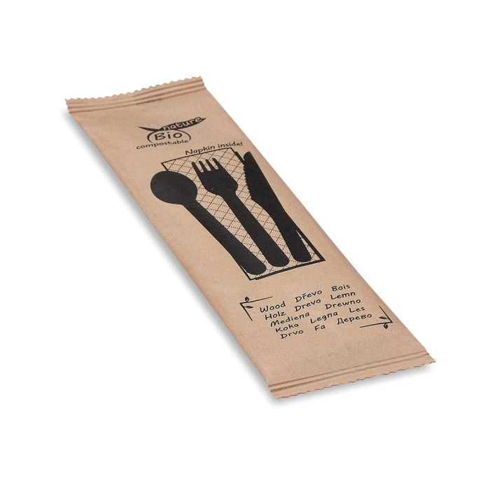 Hygienicky zabalená sada drevených príborov obsahuje nôž, vidličku, lyžicu a papierový obrúsok. Príbor má dĺžku 16,5 cm a je vyrobený z dreva. Papierový obrúsok má 2-vrstvy, rozmer 24x24cm, skladanie 1/8 a vyrobený je zo 100% celulózy. Príbor je vhodný pre studené a teplé jedlá do 100°C. Neobsahuje žiaden vosk ani lamináciu a má robustný dizajn.