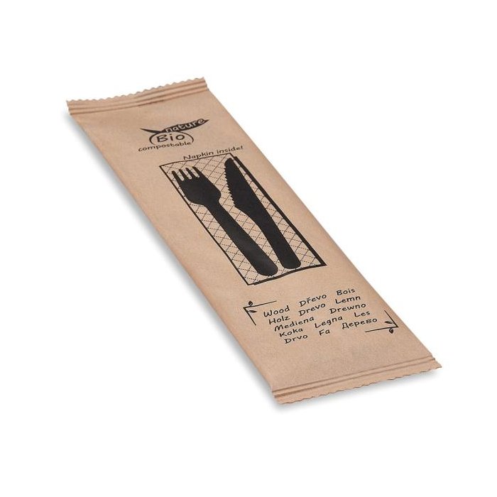 Hygienicky zabalená sada drevených príborov obsahuje nôž, vidličku a papierový obrúsok. Príbor má dĺžku 16,5 cm a je vyrobený z dreva. Papierový obrúsok má 2-vrstvy, rozmer 24x24cm, skladanie 1/8 a vyrobený je zo 100% celulózy. Príbor je vhodný pre studené a teplé jedlá do 100°C. Neobsahuje žiaden vosk ani lamináciu a má robustný dizajn.