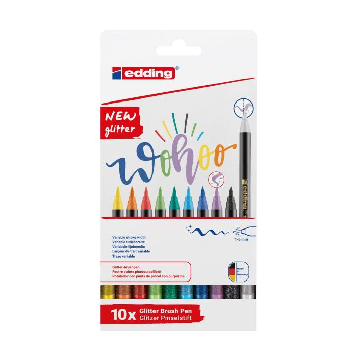 Farebný popisovač s atraktívnym trblietavým atramentom na kreatívne písanie a vyfarbovanie, na kreslenie a rozvrhovanie na svetlom papieri. Pružný štetcový hrot má variabilnú šírku stopy 1-6 mm, čo umožňuje hladké vyfarbovanie jemných detailov a väčších plôch. Atrament na vodnej báze vo filtračnom systéme je rýchloschnúci a má slabý zápach. Sada obsahuje farby žltý gliter, červený gliter, oranžový gliter, tmavozelený gliter, svetlozelený gliter, čierny gliter, modrý gliter, azúrovo modrý gliter, fialový gliter a priehľadný gliter.