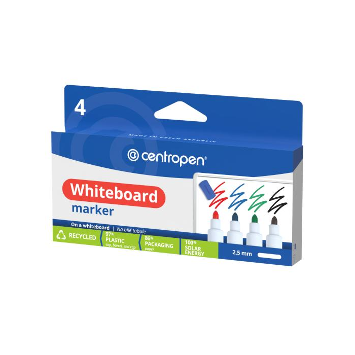 Za sucha stierateľný svetlostály popisovač. Vhodný na biele smaltované tabule, PVC, sklo, porcelán. Okrúhly hrot hrúbky 5 mm. Šírka stopy 2,5 mm. Sada 4 ks.