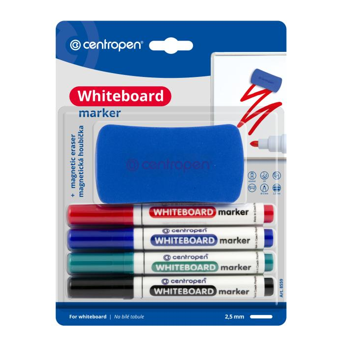 Za sucha stierateľný svetlostály popisovač. Sada 4 kusov so stierkou. Vhodný na biele smaltované tabule, PVC, sklo, porcelán. Okrúhly hrot hrúbky 5 mm. Šírka stopy 2,5 mm.