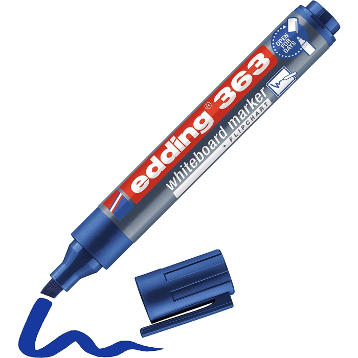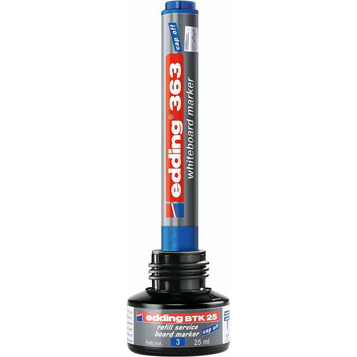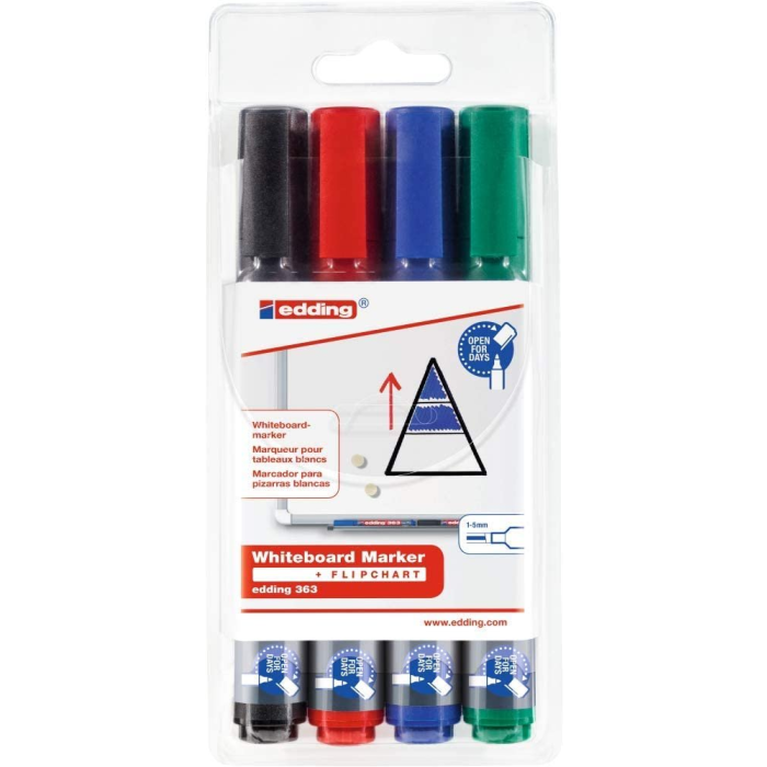 Popisovač na biele tabule s plastovým telom a vymeniteľným hrotom. Dopĺňateľný atramentom edding BTK 25. Hrot zrezaný, šírka stopy 1---5 mm. Sada 4 ks.