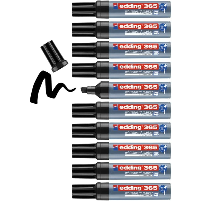 Aký všestranný môže byť jeden popisovač na bielu tabuľu? Edding 365 je všestranný podľa potreby! Vďaka variabilnému hrotu v tvare sekáča umožňuje tento konkrétny popisovač kresliť tenké grafy aj označovať veľké koláčové grafy. A čo je ešte lepšie, môže zostať aj niekoľko dní bez toho, aby vyschol – ak by niekto zabudol nasadiť kryt späť. Atrament sa dá ľahko zotrieť nasucho bez zanechania akýchkoľvek zvyškov.