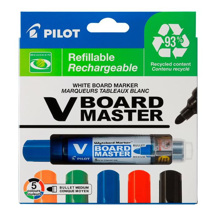 Technická inovácia, V-BOARD MASTER sú popisovače na biele tabule s vymeniteľnou náplňou s tekutým atramentom. Nový atramentový systém ponúka okamžité písanie bez pretrepávania či pumpovanie, rovnako ako plynulý výdaj atramentu: zabudnime na popisovače, ktoré píšu čím ďalej tým menej, čím viac sa používajú. Budete nadšení intenzívnymi a žiarivými farbami V-BOARD MASTER. Táto rukoväť je súčasťou série Begreen, vyrobené z recyklovaného plastu. Spoločne môžeme veľa vecí zmeniť, a pomôcť tak chrániť surovinové zdroje našej planéty. Výrobou V-Board Master Popisovač z recyklovaného plastu znižuje Pilot uhlíkovú stopu pera v porovnaní s rovnakým perom vyrábaným bez využitia recyklovaného plastu. Tým to ale nekončí: Ak aspoň trikrát vymeníte náplň, vyrovnáte tak emisie oxidu uhličitého. Od výroby až do konca životnosti výrobku sa odhaduje, že nákup tohto pera Begreen a jeho trojnásobné doplnenie náhradnou náplňou zníži celkový vplyv pera na životné prostredie o -75%** v porovnaní s nákupom ďalších 3 nových pier. Aj tak malé gesto môže významne zmeniť náš boj proti zmene klímy!