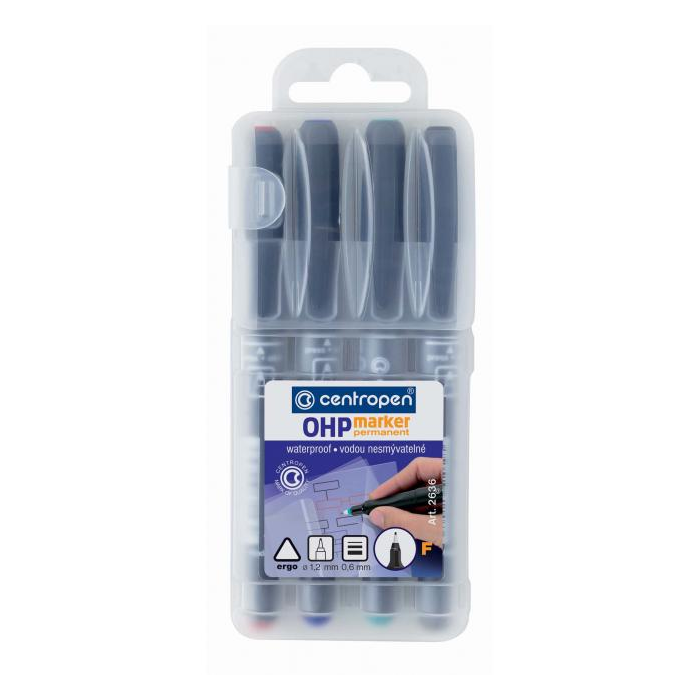 Permanentný popisovač určený nielen na popisovanie transparentných fólií do spätných projektorov, ale tiež na plastické hmoty, sklo a pod. Šírka stopy 0,6 mm. Sada 4 ks.