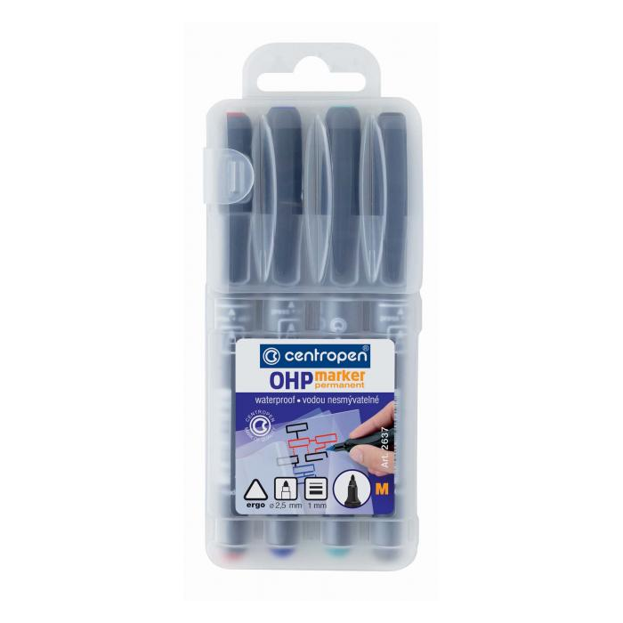 Permanentný popisovač určený na popisovanie transparentných fólií do spätných projektorov, na plastické hmoty, sklo a pod. Šírka stopy 1 mm. Sada 4 farieb.