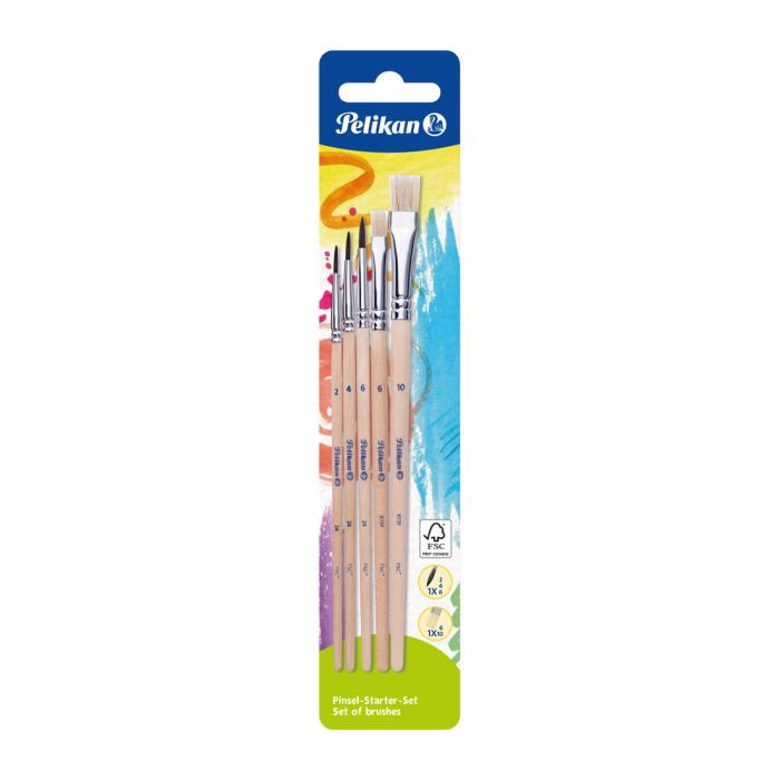 Sada štetcov Starter-Set Pelikan 5ks, v zložení: 3 ks vlasové (čísla 2, 4, 6) + 2 ks štetinové ( čísla 6, 10), rukoväť z FSC dreva. Balenie blister.