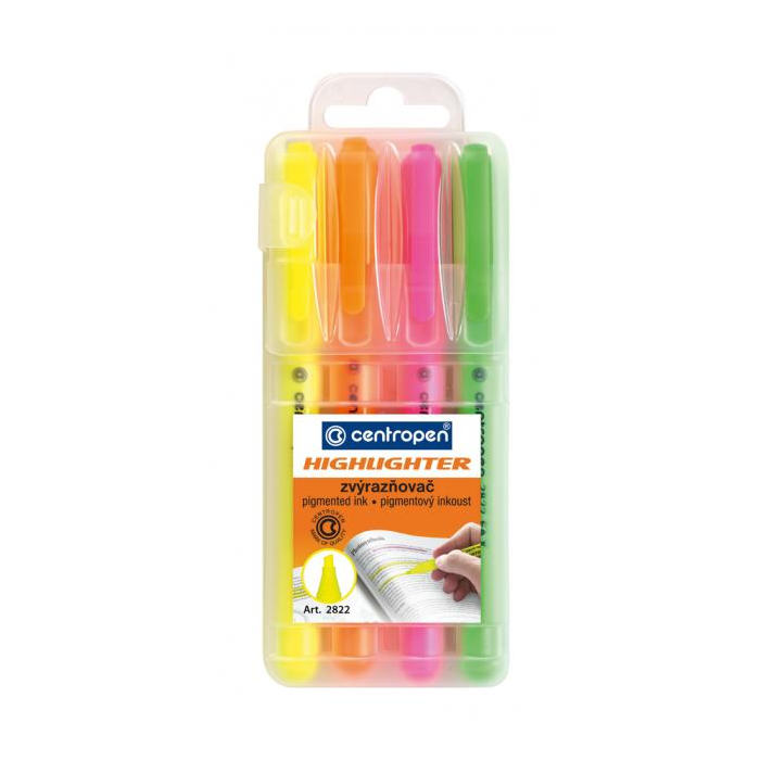 Zvýrazňovač osadený klinovým hrotom so šírkou stopy 1 - 3 mm. Plnený fluorescenčným atramentom, vhodným na všetky druhy papierov, vrátane kopírovacích a faxových. Sada 4 ks.