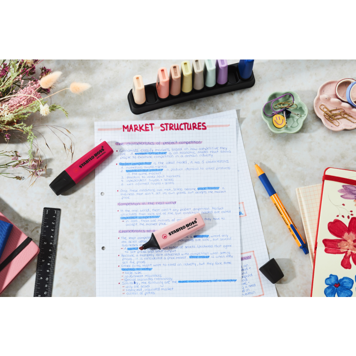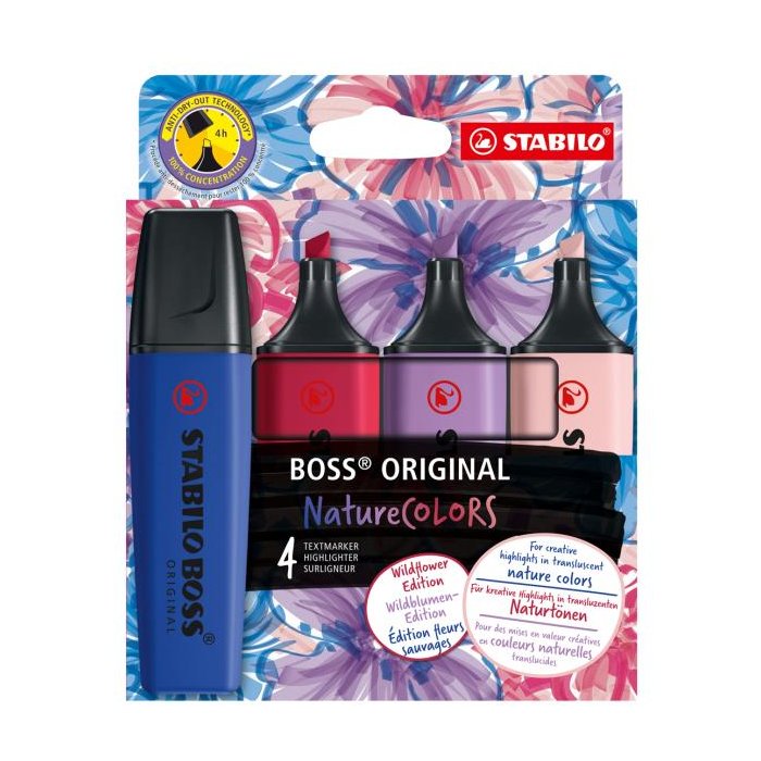Zvýrazňovač STABILO BOSS ORIGINAL NatureCOLORS Wildflower ponúka moderné odtiene a jemný zvýraznený efekt, ktorý oživí akýkoľvek dokument alebo študijný materiál. Štyri odtiene - ultramarínová, bordová, šedofialová a púdrová ružová - sú ideálne pre každého, kto chce do svojej písacej súpravy priniesť módne farby z interiéru a módneho dizajnu.