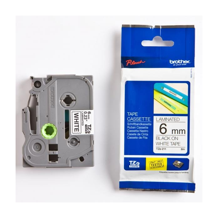Originálna kazeta s páskou TZe-211 je zárukou tvorby ľahko čitateľného štítku s ostrým textom. Kazeta TZe-211 s laminovanou páskou s čiernou tlačou na bielom podklade je rovnako praktická v domácnosti, kancelárii či pracovisku. Môže byť použitá k identifikácii obsahu šanónov, regálov až po USB flash disky, označenie kabeláže a ďalších zariadení.
