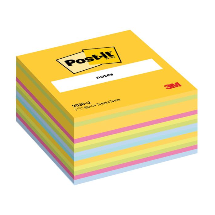 Post‑it® lístky v kocke v mixe farieb. 450 lístkov v jednej kocke. Rozmery 76 × 76 mm.
