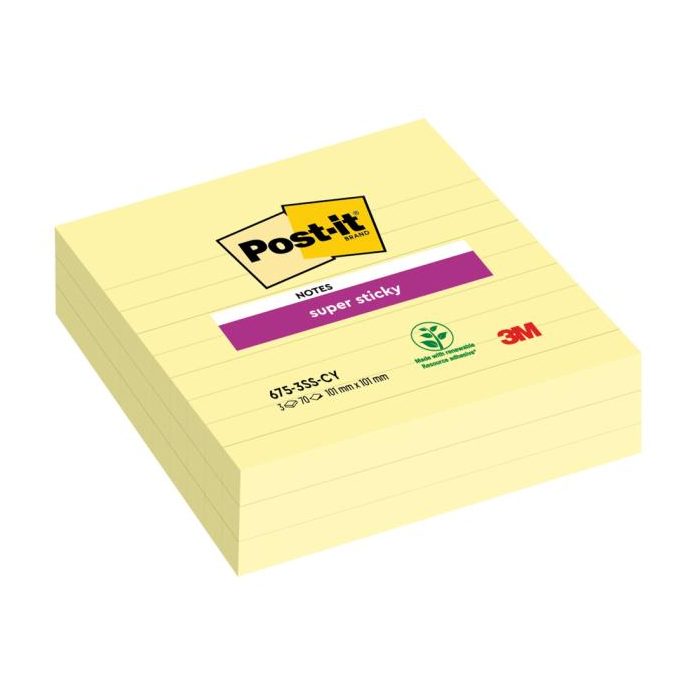Linajkový samolepiaci bloček Post-it® vo veľkom formáte v žltej farbe. Vďaka špeciálnemu lepidlu držia lístky aj na nerovnom povrchu a po odlepení nezanechávajú stopy po lepidle. Rozmery 101 x 101 mm. Počet lístkov 3x70.
