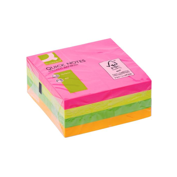 Q-Connect Quick Notes, papier s certifikátom FSC. Premiestniteľné poznámkové bloky v kockách so 400 listami, ideálne na použitie v kancelárii alebo doma, prilepia sa na väčšinu povrchov. Rozmer 76x76 mm (3x3 palce). Farba: Rôzne žiarivé farby
