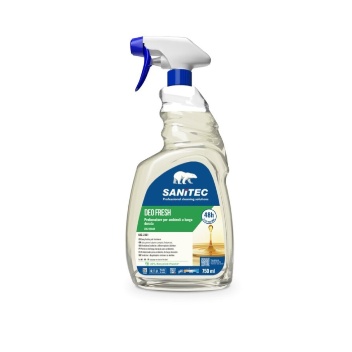 Sanitec Deo Fresh Gold Argan je prémiový osviežovač vzduchu s dlhotrvajúcou vôňou, ktorý prináša až 48 hodinovú sviežosť do každého priestoru. Vďaka inovatívnej technológii eliminácie pachov účinne neutralizuje nepríjemné zápachy a zanecháva príjemnú arómu, ktorá vytvára príjemné a elegantné prostredie. Tento sprej je ideálny pre domácnosti, kancelárie, kúpeľne, automobilové interiéry aj hotelové izby.