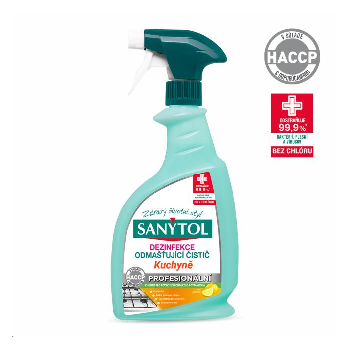 SANYTOL dezinfekcia čistič kuchyne pure. Pravidelné čistenie a dezinfekcia je jediný spôsob, ako účinne zabránit‘ šíreniu mikróbov v kuchyni. Sanytol vyvinul dezinfekčný odmast’ovač kuchyne, ktorý bez námahy odstáni väčšinu odolných nečistôt: mastnota, pripálené jedlo. Odstraňuje baktérie spôsobujúce zápach, zanecháva povrchy čisté a lesklé s vôně citrónu.