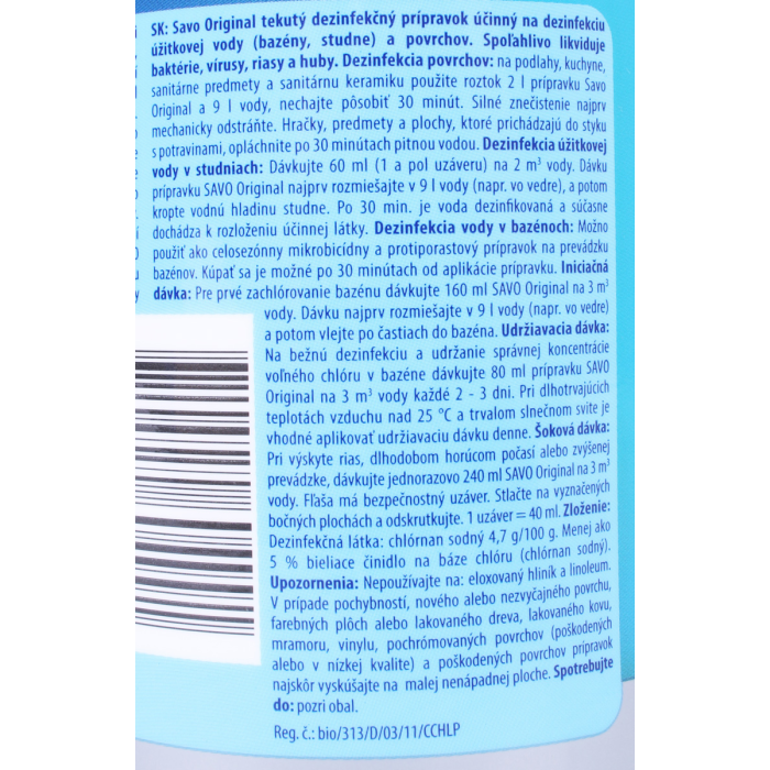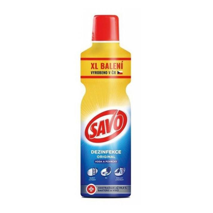 Klasický preverený čistiaci a dezinfekčný prostriedok Savo Original je určený na dezinfekciu všetkých umývateľných povrchov v domácnosti, hračiek, pomôcok pre domácich miláčikov, na údržbu podláh, ale aj na dezinfekciu vody v studniach alebo bazénoch. Savo Original likviduje 99,9 % škodlivých látok: baktérií, vírusov, plesní, kvasiniek, rias a mikroskopických húb. Vynikajúci ako celosezónny mikrobicídny a protiporastový prípravok pre prevádzku bazénov. Účinná látka v podobe chlórnanu sodného. Kvalita preverená generáciami!