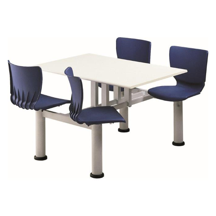 Jedálenský set do školskej alebo podnikovej jedálne, ktorý pozostáva z plastových stoličiek uchytených k rámu a dosky stola.