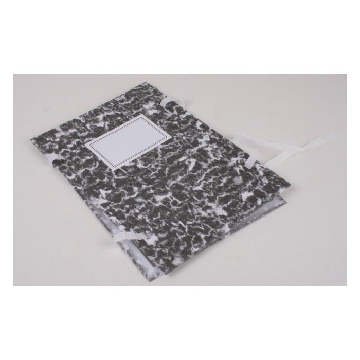 Kartónové dosky jednostranne poťahované farebným papierom bez chrbta, z 1,5 mm strojnej lepenky, spojené šnúrkami. Prevedenie mramor.