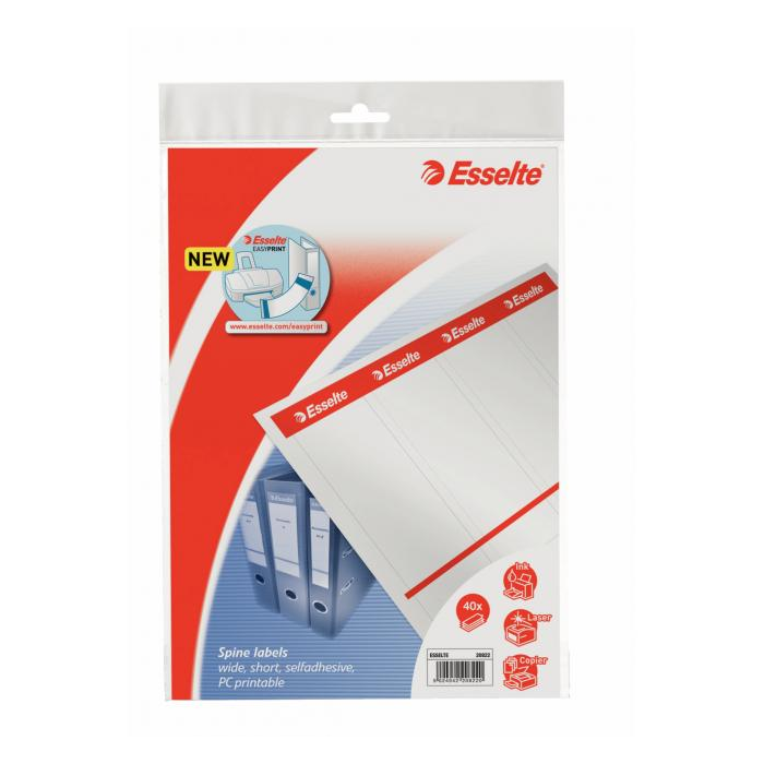 Náhradné samolepiace papierové chrbtové štítky na pákové kartónové zakladače Rainbow a Mramor, šírky chrbta 7,5 cm na identifikáciu založených dokumentov. Štítky sú vhodné na potlač do laserových a atramentových tlačiarní a kopíriek cez jednoduchý internetový nástroj `EASYPRINT` na stránke https://www.esselte.com/easyprint .V balení 10 hárkov (á 4 štítky/hárok) s predperforovanými štítkami rozmeru 59 x 192 mm. Hmotnosť papieru 80 g/m2.