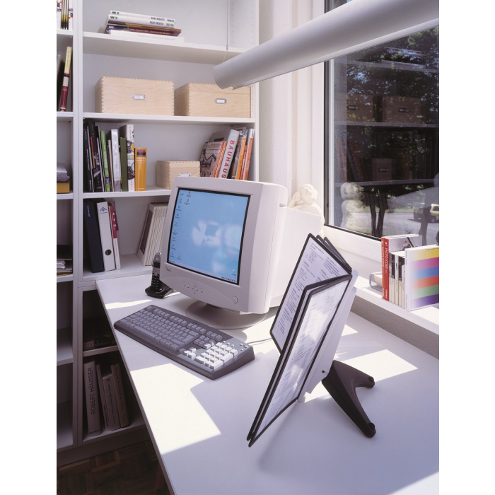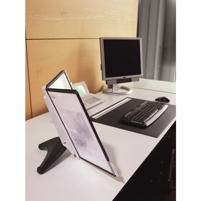 Stojan na stôl s 5 polypropylénovými displejovými panelmi formátu A4 do malých kancelárií. Stabilná základňa, systém ideálny pre užívateľov, ktorí sú obmedzení nedostatkom miesta. Farba základne i panelových rámčekov čierna.