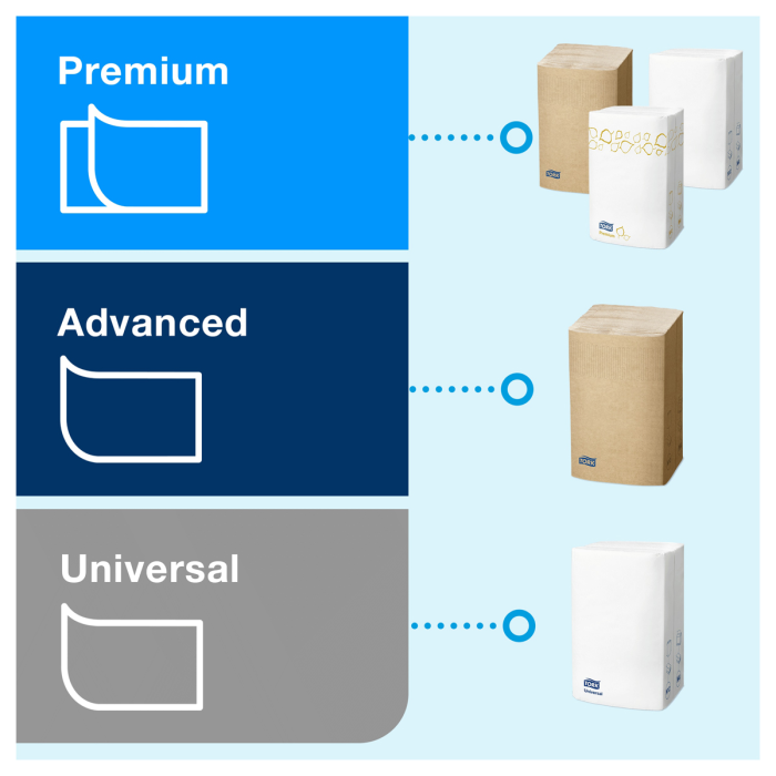 Dvojvrstvové univerzálne jemné utierky prémiovej kvality z celulózy. Utierky sú vhodné do Tork Xpress® zásobníka systému H2 na papierové utierky Multifold v stredne frekventovaných toaletách a umyvárňach. Možno ho použiť do malých priestorov a vašim hosťom poskytuje pohodlie aj hygienu.