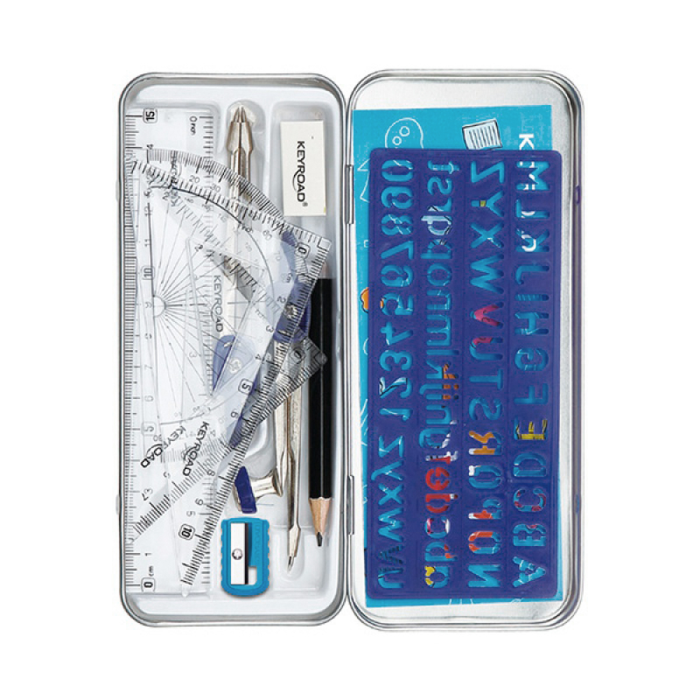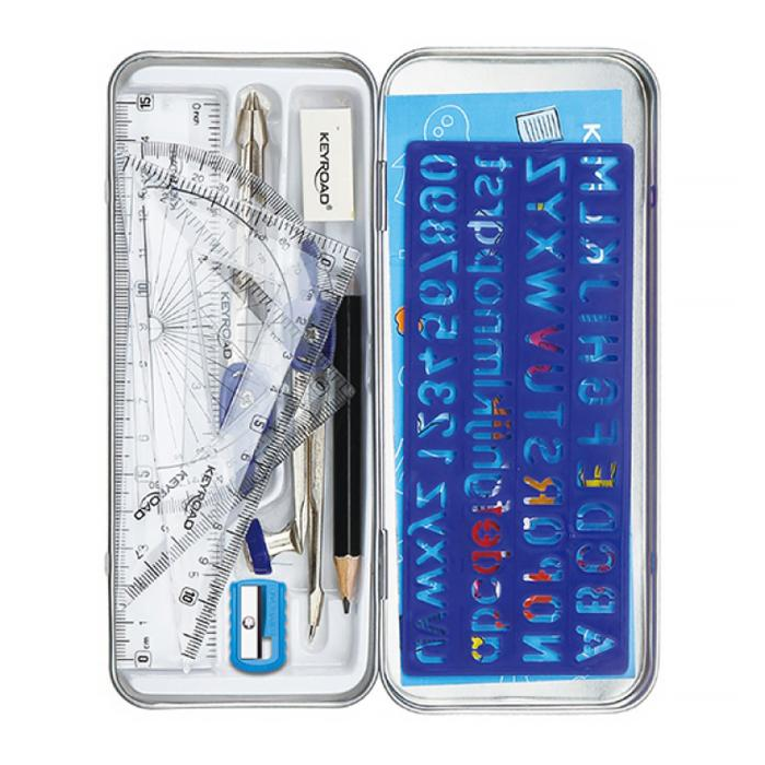Školská matematická súprava v kovovom puzdre, 11 kusov vyrobených z odolného materiálu, vysoko kvalitné produkty. Sada obsahuje: kružidlo, biela guma, strúhadlo, 180° uhlomer, 15 cm plastové pravítko, tabuľka rozvrhu hodín, plastová šablóna s číslami a písmenami, 45° plastový trojuholník, 60° plastový trojuholník, čierna ceruzka. Mix farieb.