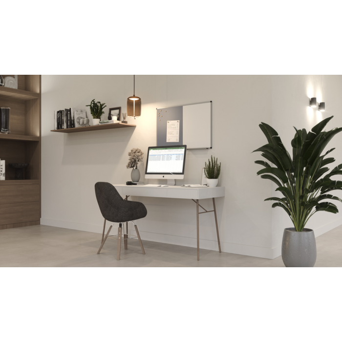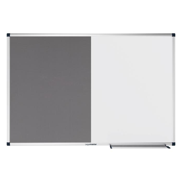 Priestorovo úsporná dvojfunkčná doska na písanie a pripínanie. Hladké písanie a výkon suchého vymazávania. Jednoduché pripevnenie poznámok, náčrtov a fotografií pomocou magnetov a špendlíkov. Jednoduchá skrytá montáž na stenu. 5 ročná záruka na dokonalú popisovateľnosť a stierateľnosť povrchu dosky pri použití v kombinácii s príslušenstvom Legamaster. Tento produkt je vyrobený z materiálu z dobre obhospodarovaných lesov s certifikátom FSC® a iných kontrolovaných zdrojov (FSC C158462). Funkčná tabuľa a nástenná tabuľa na príležitostné použitie v kancelárii alebo domácej kancelárii. Jedna polovica: Magnetická lakovaná oceľová tabuľa vhodná na popisovanie za sucha stierateľnými popisovačmi na tabuľu. Druhá polovica: Nástenka s plsteným povrchom. Hliníkový rám so sivými plastovými rohovými krytmi (Pantone 433C). Možno namontovať horizontálne alebo vertikálne. Zásobník na popisovace (30 cm) s koncovými krytmi, montážna sada a montážny návod sú súčasťou balenia.