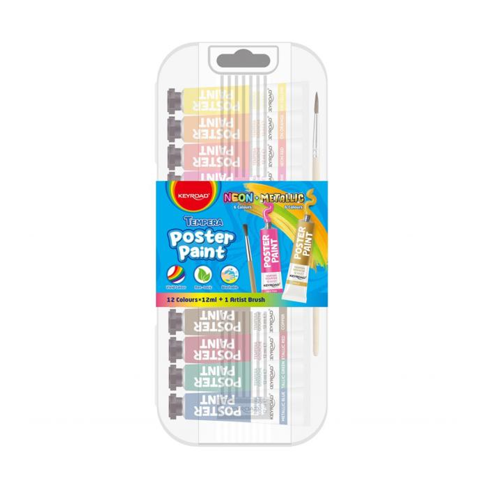 Farby na plagáty v žiarivých farbách Ideálne na kreatívne maľovanie Netoxické a bezpečné pre deti Farby sa dodávajú s bezplatným štetcom V kovových tubách Objem: 12 ml 12 tub v balení Farba: Zmes metalických a neónových farieb