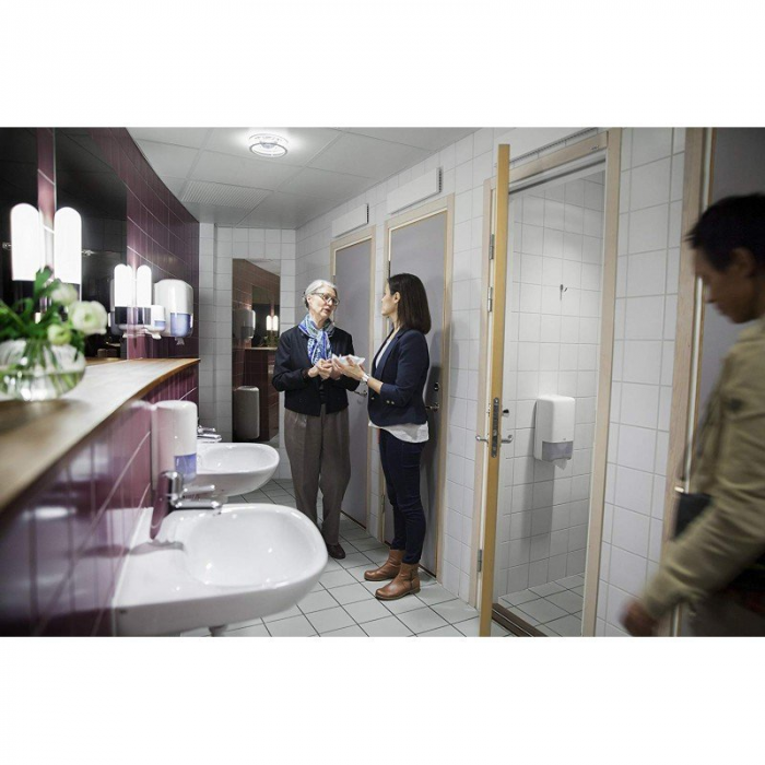 Dvojvrstvový biely toaletný papier z celulózy do zásobníkov Tork Mid-size, balený v kartóne po 27 ks. Dĺžka kotúča 100 m, priemer kotúča 13,2 cm.