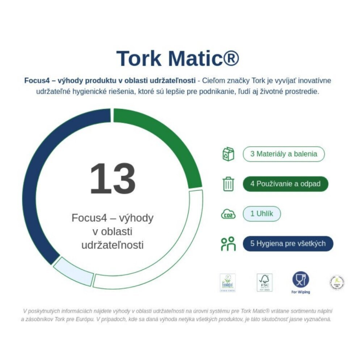 Tork Matic® papierové utierky na ruky v kotúči Advanced sú jemné a absorpčné, aby poskytovali účinné vysušenie rúk. Kotúče možno použiť pre Tork Matic® zásobník na papierové utierky v kotúči, ktoré boli vyvinuté na jednoduchú údržbu na frekventovaných toaletách a umyvárňach. Šetria čas a znižujú spotrebu vydávaním útržkov po jednom.