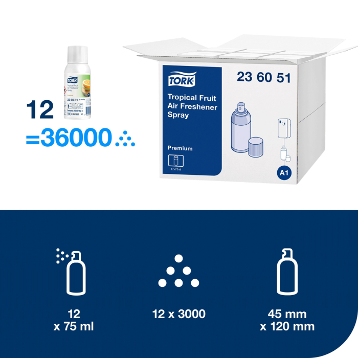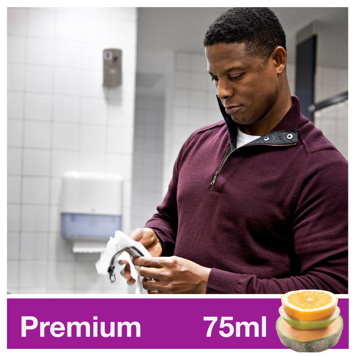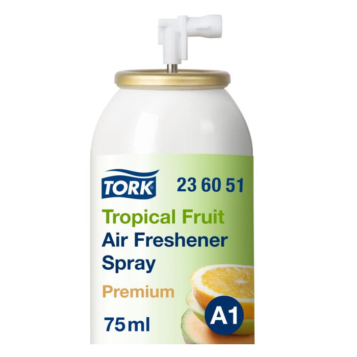Vôňu vo vašej toalete a umyvárni môžete dôkladne a efektívne kontrolovať vďaka Tork ovocnej vôni do osviežovača vzduchu. Spreje obsahujú vonné oleje a patentovanú zložku neutralizujúcu zápachy na elimináciu nepríjemných zápachov, a zároveň poskytujú dlhotrvajúci pocit čerstvého vzduchu. Spreje sú vhodné do Tork elektronického osviežovača vzduchu.