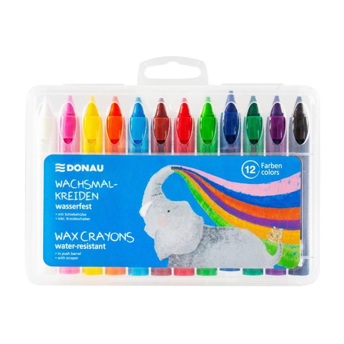 12 vodeodolných farebných voskových pasteliek, ktoré sú ideálne na kreatívne tvorenie. Pastelky sa dodávajú v praktickom posuvnom tubuse pre jednoduché skladovanie a vyberanie. Súčasťou balenia je aj škrabka na pastelky pre ešte viac kreatívnych možností.
