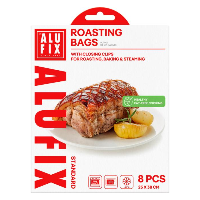 Vrecká na pečenie ALUFIX. Špeciálne vrecká na pečenie s klipsami na zatváranie. Rozmery vrecka 25x38cm. Balenie obsahuje 8ks. Výrobok je určený k použitiu v plynových a elektrických rúrach bez priameho kontaktu so zdrojom tepla.