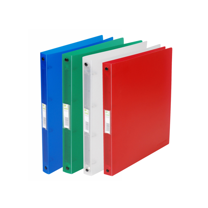 Krúžkový zakladač z polypropylénu. Formát A4. Väčšie balenie 12 ks. Krúžok 16 mm. Chrbát 2 cm. Farba transparentná červená.