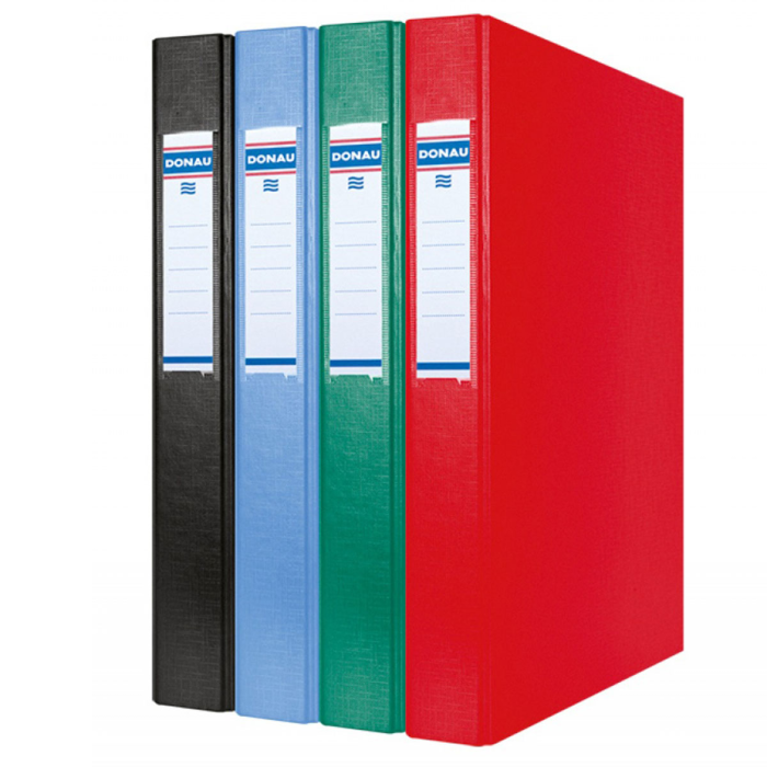 Zakladač so 4 krúžkami v tvare O a priemeru 25 mm, vyrobený z kartónu s hrúbkou 1,9 mm a gramážou 1170 g/m². Potiahnutý z vonkajšej strany ekologickou PP fóliou s plátennou štruktúrou o hrúbke 100 µm a z vnútornej strany podšívkou z bieleho papiera. Vymeniteľný obojstranný štítok na chrbte. Väčšie balenie 10 ks. Farba: modrá Šírka chrbta: 40 mm Rozmery: 265 x 320 x 40 mm Formát: A4
