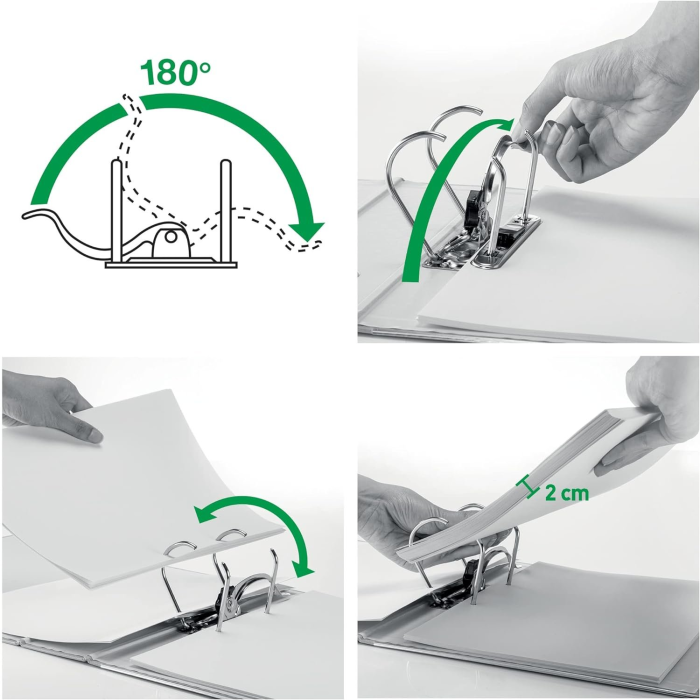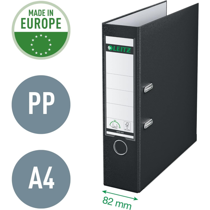 Patentovaný pákový celoplastový zakladač formátu A4 vyrobený z kvalitného kartónu. Vonkajšia strana potiahnutá farebnou polypropylénovou fóliou, vnútorná svetlosivou fóliou. Zakladač je vybavený vysokokvalitnou mechanikou Leitz, chrbtovým krúžkom, kovovou lištou a vymeniteľným papierovým štítkom na popis. Vysokokvalitná mechanika umožňuje o 50 % širšie otvorenie zakladača než dovoľuje bežná páková mechanika, čo znamená až 20 % úspory času pri manipulácii a archivácii dokumentov. Šírka chrbta 8 cm.