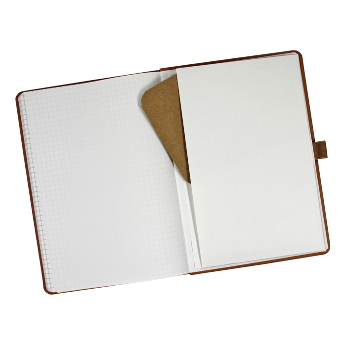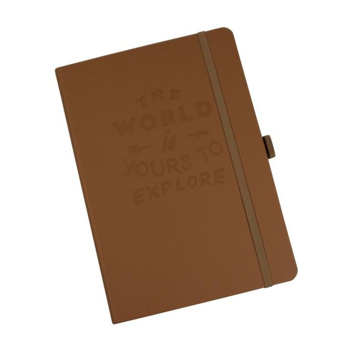 Zápisník outdoorový A5, štvorčekový. Vodoodolný obal s dizajnovým razením, 56 listov vodoodpudivého papiera, 120 g/m². S pútkom na pero, gumičkou a archívnym vreckom. Farba hnedá.