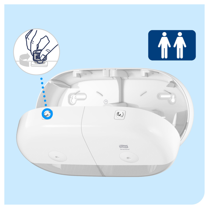 Tork SmartOne® Twin mini zásobník na toaletný papier v dizajne Elevation je moderný a efektívny systém zásobníkov vhodný pre náročné toalety a umyvárne s vysokou návštevnosťou. Tým, že sa doň zmestia dva kotúče, a dávkovaním po útržkoch, pomáha znižovať spotrebu až o 40 % v porovnaní s tradičnými jumbo kotúčovými zásobníkmi, čo znamená viac návštev na jeden kotúč. Zásobníky Tork Elevation majú praktický a moderný dizajn, ktorý zanecháva v hosťoch dlhodobý dojem.