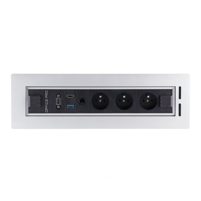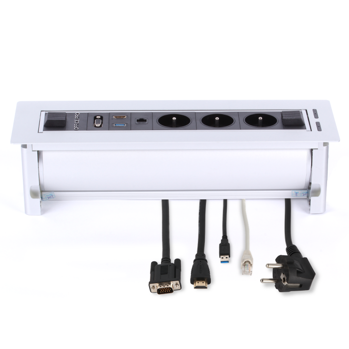 Prípojné miesto je pohodlne k dispozícii priamo na pracovnom stole. Pripojenie k projektoru a ozvučenie zvládne cez konektory VGA, HDMI či AUDIO jack každý. Panel obsahuje elektrické, dátové a AV prípojné body. Otáčanie pomocou elektromotora a magnetickej spojky. Bezpečnostná fotobunka proti zatvoreniu pri prevádzke. Záruka 3 roky.