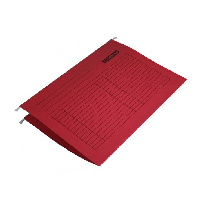 Závesný obal na zakladanie voľných listov do formátu A4. Kovové závesné háčiky garantujú dlhodobé používanie. Súčasťou obalu je plastový index a papierový štítok. Papier 230g. Farba: červená Balenie: 25 ks