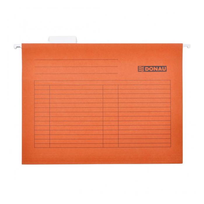 Závesný obal na zakladanie voľných listov do formátu A4. Kovové závesné háčiky garantujú dlhodobé používanie. Súčasťou obalu je plastový index a papierový štítok.Papier 230g. Farba: oranžová Balenie: 25 ks