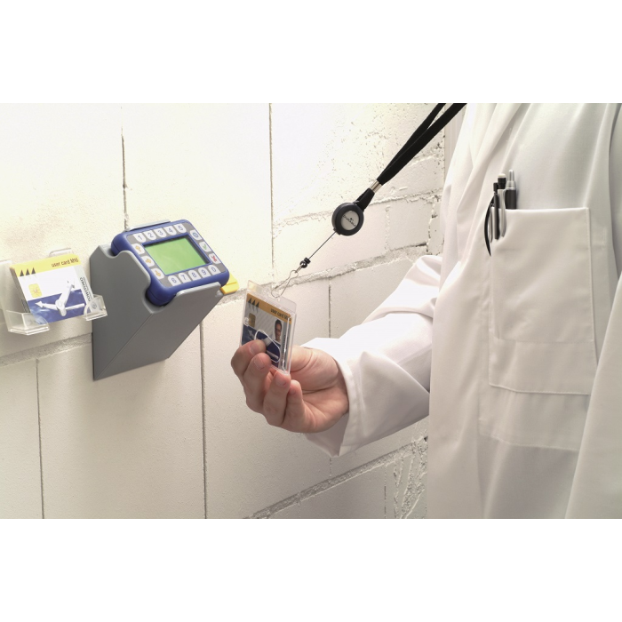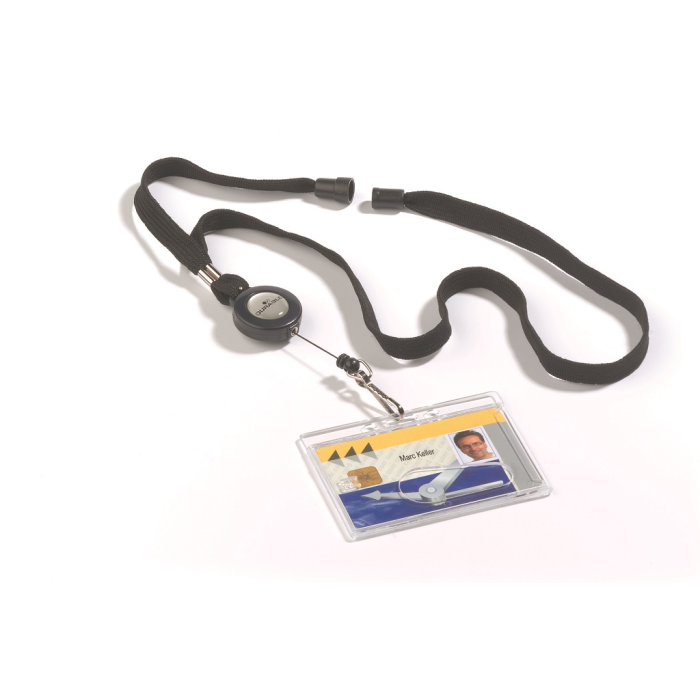 Kombinácia výsuvného kotúča a remienka na krk šírky 10 mm s bezpečnostnou poistkou, ktorá sa uvoľní pri zachytení remienka alebo pri silnom potiahnutí. Vďaka tomuto spôsobu uchytenia je možné s kartou pohodlne manipulovať. Vysunutie kotúča do 80 cm, remienok dĺžky 44 cm. Balenie 10 ks.