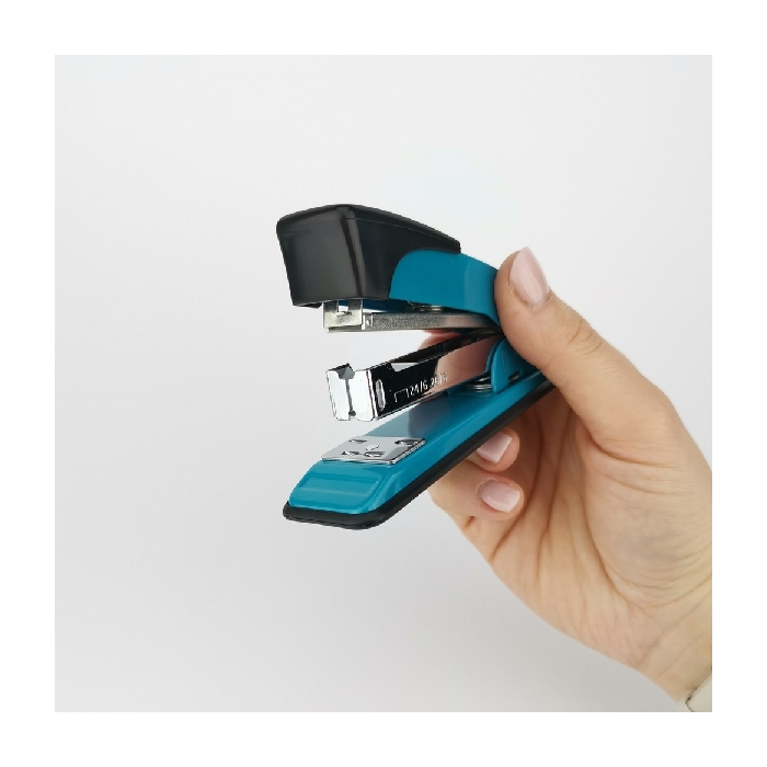 Funkčná kancelárska zošívačka. Užitočný pri každodennej práci, nenahraditeľný pri organizovaní a triedení dokumentov. Kovové puzdro s plastovými protišmykovými podložkami na ramene a základni. Maximálny počet zošitých hárkov: 30 Maximálna hĺbka vloženia hárkov: 50 mm Počet sponiek v zásobníku: 70 - veľkosť sponky: 24/6; 26/6 - dĺžka základne: 11,7cm - záruka 5 rokov - modrá farba.
